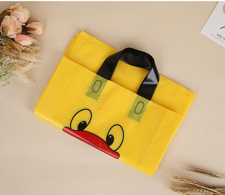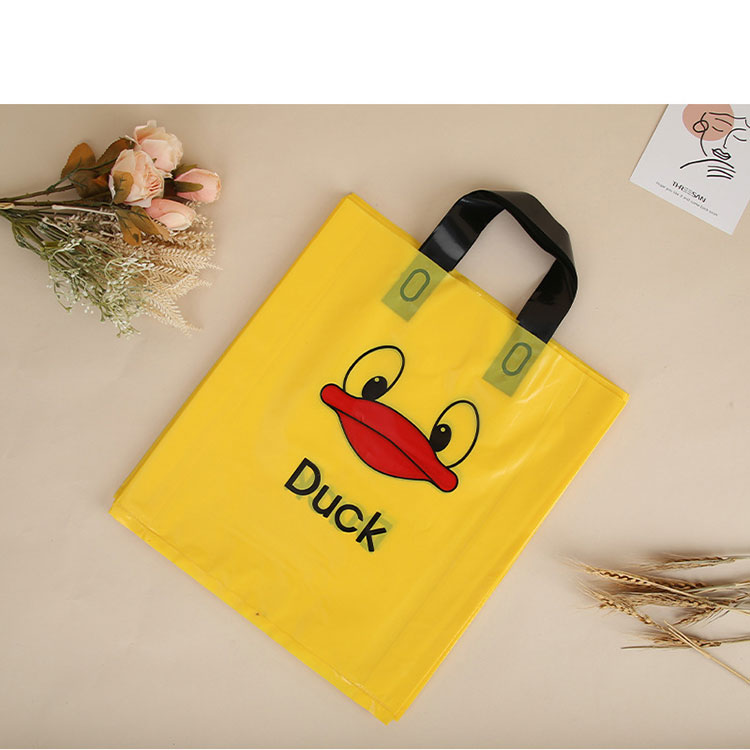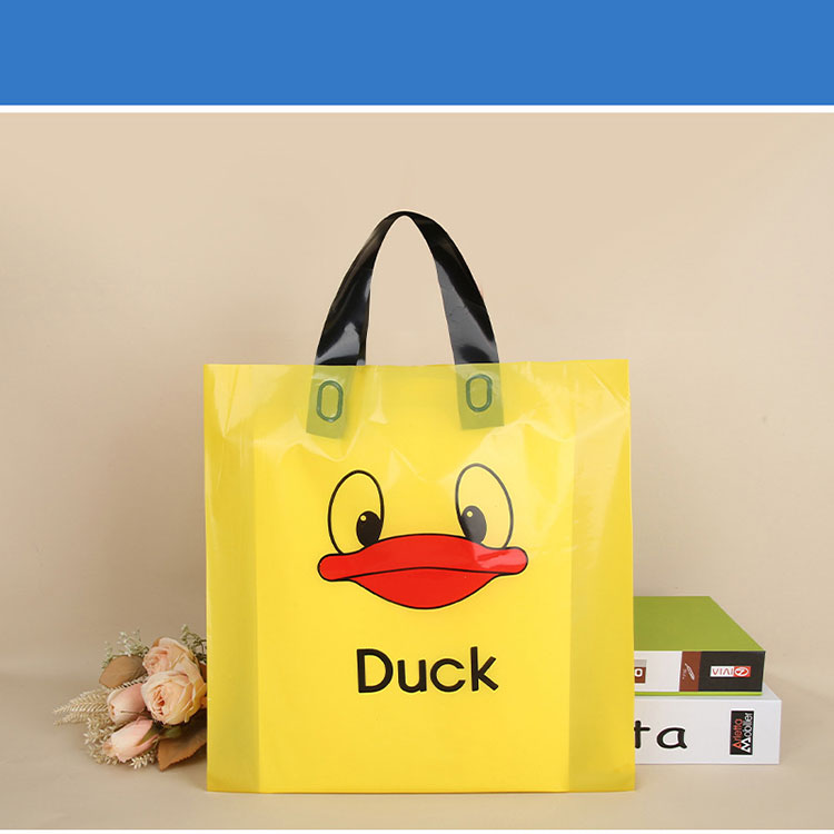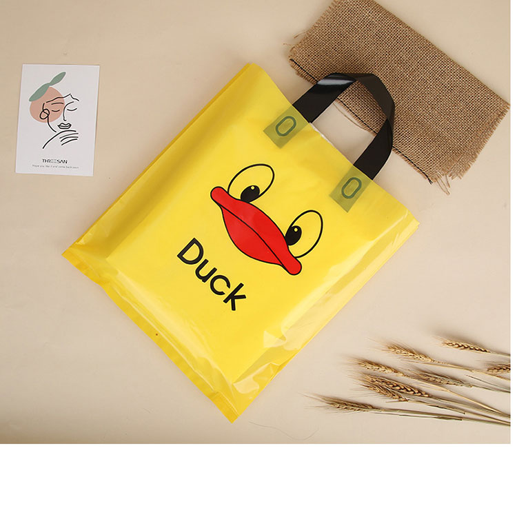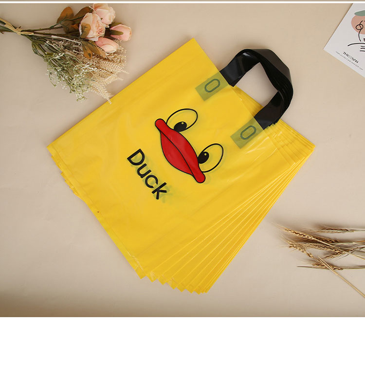 ব্যাগের রঙটি হলুদ এবং কালো হ্যান্ডেলটি পিই হ্যান্ডেল ব্যাগগুলিতে মুদ্রিত হাঁস এবং চিঠিগুলির সাথে পুরোপুরি মেলে। হ্যান্ডলগুলি তুলনামূলকভাবে দৃ ur ়, যতক্ষণ না তারা খুব বেশি ভারী আইটেম রাখে না। এটি প্রসাধনী, জন্মদিনের উপহার এবং টয়লেটরিগুলি রাখার জন্য উপযুক্ত।